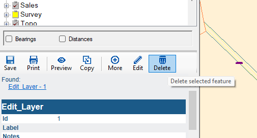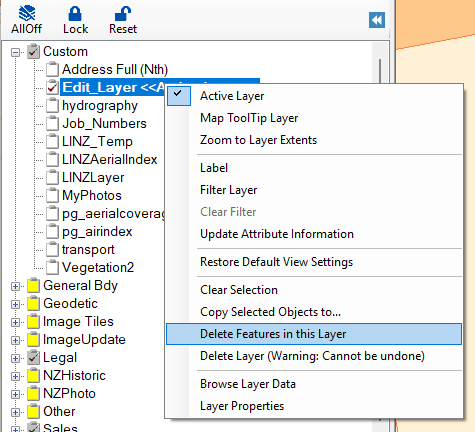 To delete individual features from the Edit Layer or a Custom Layer, make sure the feature is selected (using the Info Tool). TIP, to select the feature, make sure the layer the feature is saved in is made the ‘Active Layer’ which you can do by left clicking on the layer.
