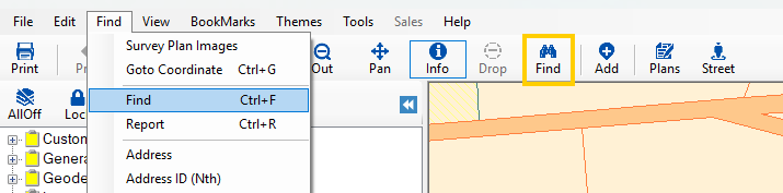 The Find Window is set to display automatically when Quickmap opens, however, it is possible to to hide or show the Quickmap search (Find) window each time Quickmap starts up. It allows you to find one or more properties using a number of different possible search methods such as Address, Owner, Legal Description, Place Name and more.